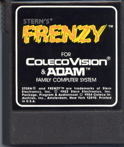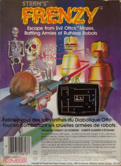 Frenzy is the sequel to Berzerk and gameplay is similar. You are chased around a maze of rooms by various robots and your player must avoid their lasers and shoot them back to destroy them. There's only so much time the player can stay in a room before a "Robot Attacks" occurs and a smiley face of death moves in on the player. In Frenzy there are also reflective mirrors in place of certain walls which reflects shots back and allow you to ricochet your fire. Also unique to Frenzy are four "device rooms" with a special icon in the center of the room that may be destroyed for bonus points and a special effect within that room.