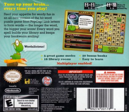 In this Nintendo DS adaptation, players will spell their way to a higher rank across three different game modes. Players can link letters in the fast-paced Action mode; if laid-back wordplay is more their style, Classic mode provides plenty of action at their own pace; or for the ultimate challenge, players can compete against friends in the Multiplayer mode. The Multiplayer mode is a new feature offered for the first time in any version of Bookworm, and is played over the DS WirelessCommunications network.