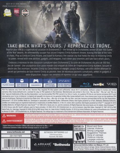 Dishonored 2 is set 15 years after the Lord Regent has been vanquished and the dreaded Rat Plague has passed into history. An otherworldly usurper has seized Empress Emily Kaldwin's throne, leaving the fate of the Isles hanging in the balance. As Emily or Corvo, travel beyond the legendary streets of Dunwall to Karnaca, the once-dazzling coastal city that holds the keys to restoring Emily to power. Armed with the Mark of the Outsider and powerful new abilities, track down your enemies and take back what's rightfully yours.