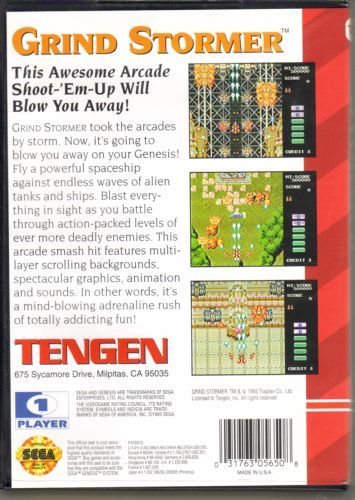 Grind Stormer, also known as V, is a vertically forced scrolling shoot 'em up developed for the arcade by Toaplan, and ported to the Sega Mega Drive in 1993 by Tengen.