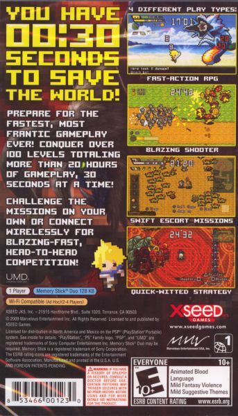 Half-Minute Hero is a bold new concept of having the player save the world, 30 seconds at a time. The player must fight, shoot, summon and protect in four distinct modes, each containing a different perspective and unique gameplay style, across a total of 120 varied stages. The 8-bit graphics and story elements provide a unique style and humour, whilst the hard-rocking soundtrack keeps pace with the breakneck speed of gameplay.
