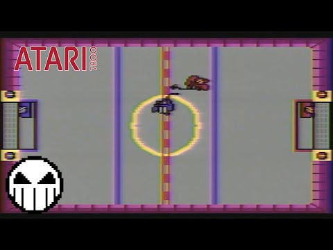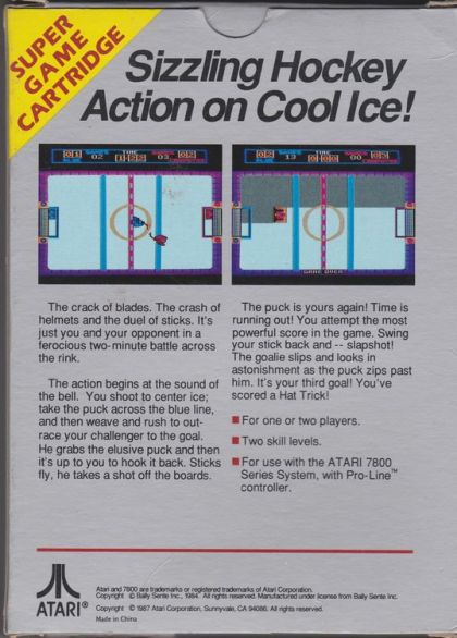 Hat Trick is a two-on-two hockey game based on the 1984 coin-op of the same name. Each player controls a goalie and a skater. The object is to shoot the puck into the opposing teams goal. Each game lasts two minutes.