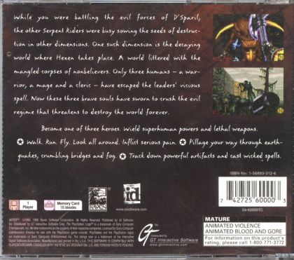 Like Heretic, Hexen is a fantasy game based on an enhanced DOOM engine. All of Heretic's innovations like vertical looking, flying, and the inventory system have been carried over. The new major changes this time around are three characters for the player to choose from and the level hub system. The characters are the Fighter, the Cleric, and the Mage. Each one has four unique weapons and different levels of speed and armor.