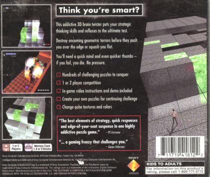 Intelligent Qube is a classic puzzle game for the PlayStation. It is known as Kurushi in Europe and Australia. It received an Excellence Award for Interactive Art at the 1997 Japan Media Arts Festival.