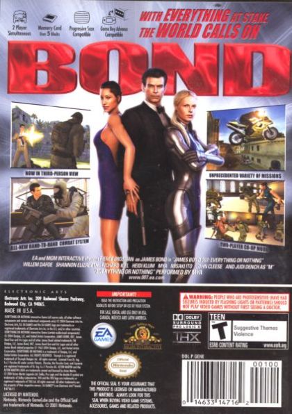 What would James Bond do? That's the question players will answer in every dramatic moment of James Bond 007: Everything or Nothing, as the world's greatest secret agent returns in his fifth interactive adventure under the EA GAMES brand. First, you will think like Bond, using espionage, tactical skills, and gadgets from the Q-Lab to analyze your situation. Then you will act like Bond, using his stylish physical skills, clever subterfuge, and bold personality to once again save the world. Finally, you will see every Bond moment from the new third person perspective that shows the Hollywood cast playing out a real-time cinematic action adventure that could only come from the world of James Bond.