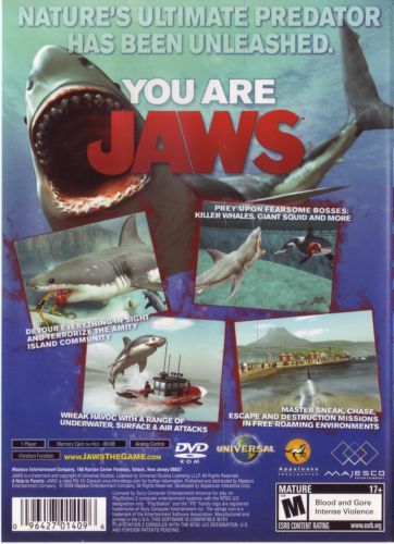 Jaws is a new kind of 3rd-person adventure, where you become the deadly ocean predator from the classic movies. Driven mad by low-frequency radio waves, you'll eliminate the oil drilling crews and equipment responsible for the frenzy-causing emissions. Armed with 3000 teeth and powered by 5000 pounds of muscle, you will hunt down and annihilate your enemies in an accurate undersea world. Over 25 points of disconnection, allowing characters and objects to be torn apart by Jaws, piece by piece Follow story-based missions, enounter side missions or roam the island area causing havoc