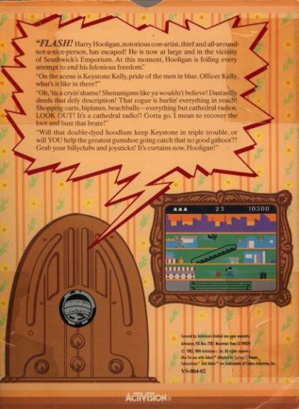 The notorious thief Harry Hooligan is on the loose! You play the part of Officer Keystone Kelly, sent in to capture Harry. Harry is trapped in a four story mall, and is running as fast as he can to reach the exit at the top. Your job is to catch up to him and send him to prison. You will need to use either the escalators at the end of each floor, or the elevator in the middle to go from floor to floor. The escalators may be further away, but the elevator moves pretty slowly so you will need to decide which route will be faster in getting you closer to your goal. If Harry can make it to the top before you catch him, you will have to retry that level. Harry has no intention of letting you catch him easily, and is hurling everything he can find in an attempt to slow you down. Shopping carts, bouncing balls, biplanes, and more will all be flying past on the screen and will either slow you down or send you back to the beginning if you get hit. As the levels progress, Harry will run faster and faster, and more objects will be tossed your way to duck and jump over.