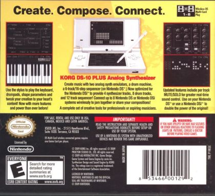 Create music with two analog synth emulators, a drum machine, a 6-track/16-step sequencer(on Nintendo DS). Now optimized for the Nintendo DSi to provide 4 synthesizer tracks, 8 drum tracks, and 12 track sequencer! Connect up to 8 Nintendo DS or DSi systems wirelessly to jam together or share your compositions!