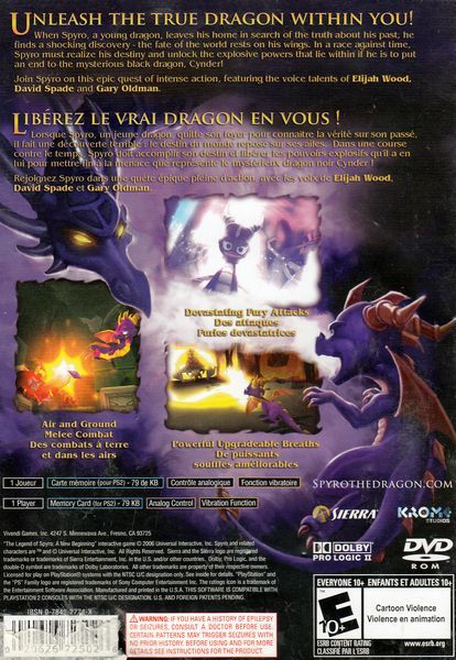 The Legend of Spyro: A New Beginning explores the true origins of Spyro as you embark on a dangerous, combat-driven quest that will bring you face to face with the Dark Master's ultimate creation, Cynder. Experience the true power of the purple dragon as you unleash devastating fury attacks, upgradeable breaths and ground to aerial melee combos in a frenzied battle with hordes of menacing enemies and bone-chilling bosses. It's an epic and cinematic gameplay experience.