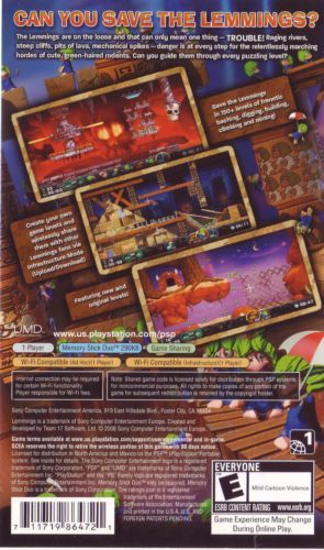 This classic puzzle game of frenetic action is now on the PlayStation Portable system. As the Lemmings mindlessly wander about deadly environmental hazards, control their fate over raging rivers, steep cliffs and pools of lava. Command them to dig tunnels, build steps, stop traffic and climb walls so that they can escape each perplexing level. With more than 150 levels of addictive gameplay, enhanced graphics, a level editor, game sharing and more, you'll be obsessed with saving the Lemmings.