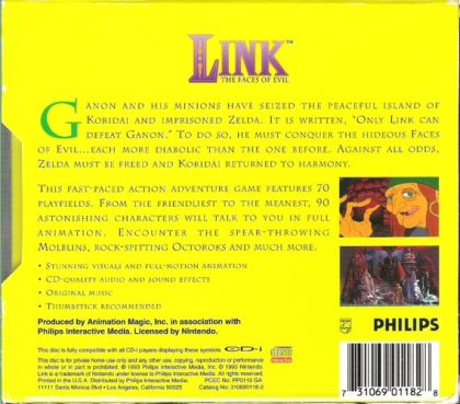 This is one of three Zelda-based games released for the CD-i. Ganon and his cronies have seized the island of Koridai and kidnapped Princess Zelda. Link must fight through Ganon's minions to defeat the Faces of Evil, one at a time. He must also destroy Ganon, free Zelda, and bring peace back to Koridai. This is a side-scrolling platform game with animated cut scenes like Zelda: The Wand of Gamelon.