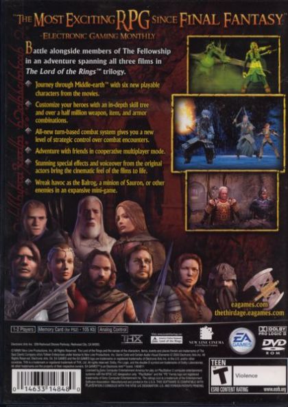 Experience the first console roleplaying game (RPG) set in The Lord of the Rings universe in The Lord of the Rings, The Third Age from EA GAMES. Travel in the wake of the Fellowship in a unique structure that allows players to explore their own path while periodically intersecting the major events of New Line Cinema's film trilogy. Traverse through both familiar and seldom-glimpsed locations as you fight to save or destroy Middle-earth in an epic adventure. Encounter the demonic Balrog in the Mines of Moria, defend the fallen city of Osgiliath, or try to destroy Helm's Deep. These choices and many more will confront you as you align yourself with the people of Middle-earth or undertake missions on behalf of Sauron.