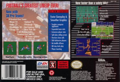 The Genesis version features John Madden's digitized commentary speech and a battery-backed RAM for saving playoff results and player stats.