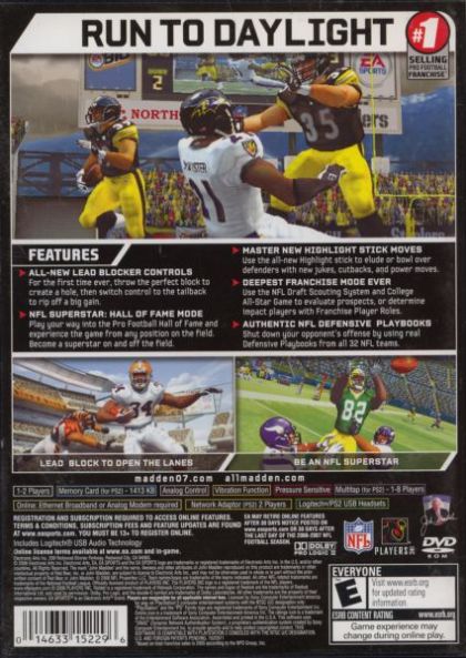 With the exclusive video game license of the NFL and PLAYERS INC, Madden NFL 07 continues to be the #1 football franchise in history. In its 17th installment, you control the running game like never before. For the first time ever, step up as the lead blocker to create a hole, and then take control of the tailback and smash through, overpower, or slash away from would-be tacklers as you fight for every yard. Innovative rushing controls give you a game-breaking ground attack featuring all-new jukes, cutbacks, and the distinct running styles of your favorite backs. Between the tackles or in the open field, run to daylight with Madden NFL 07.