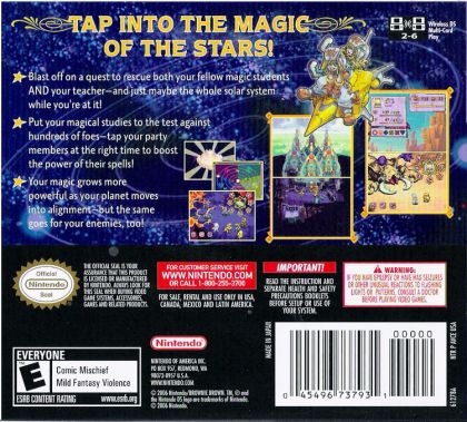 The game's combat plays like a traditional role-playing game. The difference comes from the command wheel and the stylus interface. Players tap on the attacks they want to use and then tap on an enemy to target. The game focuses on magic attacks: Each character has a "sign" linked to one of the planets that determines the type of magic he or she uses. As the planets move through the solar system, the effectiveness of magic spells shifts, requiring an ever-changing battle plan: Monsters and characters grow stronger as their planets shift into prominence and weaker as they move out of those positions. Players can check the planets' positions by tapping on the astrolog.