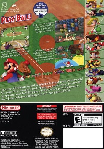 Mario and friends are challenged to play baseball with Bowser. So they play ball games with each other to decide who should play Bowser. The rules are the same as any other baseball game with some exceptions. Like other baseball games, each team gets three strikes, three outs, and four balls per inning. However, you can choose to play less than nine innings. You can also choose from Exhibition, Challenge, Toy Field, and Minigame modes. Exhibition mode is one game between two teams. In Challenge mode, you choose a team to play every other team; you can get the other teams characters by completing certain challenges. When you beat the other teams, you get a chance to play Bowser's team. In Toy Field mode, up to four players take turns to get the most points; players receive points by hitting the ball at certain spots, which consist of out, 1-, 2-, or 3-hits, or homerun spots. You can get a turn by catching the ball when your opponent hits the ball. At the start of Exhibition and Challenge modes, you choose your team captain. In Exhibition mode, you also choose team members, but in Challenge mode, your team members depend on which captain you pick.