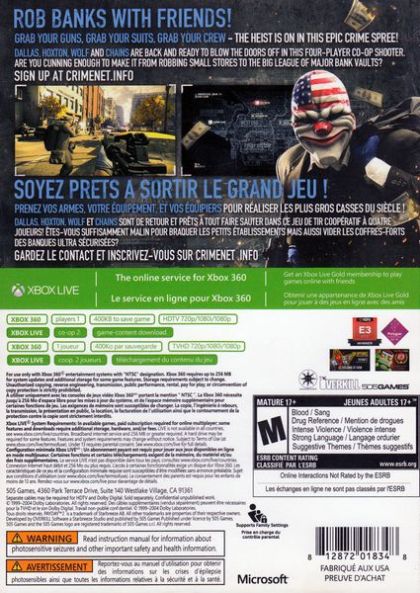 Put a crew together for the second entry in the thrilling heist shooter PayDay. Don the masks of the original PayDay crew -- Dallas, Hoxton, Wolf and Chains -- and descend on Washington D.C. for an epic crime spree. The new CRIMENET network in PayDay 2 offers a huge range of dynamic contracts and players are free to choose anything from small-time convenience store hits or kidnappings, to major league cyber-crime or emptying out major bank vaults for that epic PAYDAY. While in D.C., why not participate in the local community and run a few political errands?