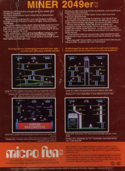 You play the part of Bounty Bob, and it is your mission to explore every inch of an abandoned mine. As you walk over floor sections in the mine, the floor will change color. When all of the floor sections have been changed in color, you can move on to the next, more challenging level. To reach all of the floor sections, you will need to figure out how to get there! You can jump (be careful not to fall too far though, or you will be squished), climb up and down ladders, and use different transportation devices that can be found on the levels (such as an elevator, slides, a springboard, or a canon!) Wandering around the mine are numerous radioactive creatures which get in Bounty Bobs way. Also scattered throughout the mines are various artifacts left behind; if Bounty Bob collects one of these, the creatures will temporarily become vulnerable. If Bounty Bob runs into one of the creatures in this state the creature will be destroyed, but if he runs into a creature while it is glowing Bounty Bob will be destroyed! There is a total of ten different levels, and to complete them all you will need quick reflexes as well as figure out a unique strategy for each level.