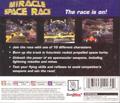In Miracle Space Race, you choose from one of six different characters to try to win one of three available space kart tournaments. You have several weapons to choose from, including missiles, mines, turbo boosts and shields.