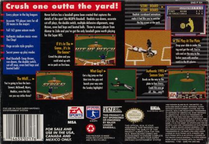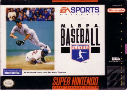 The strategy of baseball is merged with a fast-paced arcade game in MLBPA Baseball from Electronic Arts. Details designed to appeal to the die-hard fan include: real players with statistics based on the 1993 season; a full 162 game season mode; stadium music; animated scoreboards; defensive alignments; cut-off plays; run-downs; and even the double switch. Features meant to appeal to the casual fan include: large colorful arcade graphics; one stadium with animated crowds; a simplified pitching interface allowing players to steer the ball; and a batting interface that relies on timing instead of aiming cursors. Secret power-up play modes await so step up to the plate and take some hacks! Season play can be continued using passwords provided at the end of each game.
