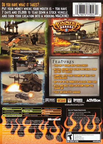 Based on the contemporary Discovery Channel program, this port of Invictus' 2004 home computer version of Monster Garage presents players with 3,000 (virtual) dollars and a week (of game time), then challenges them to tear down a stock vehicle and build it back up with customized features that meet specific conditions. As in the television show, each challenge is different -- players may be building a large fire truck in one mission and a zippy swamp buggy in the next. Consistent in all missions is an open-ended format, designed to encourage competitors to solve problems creatively and meet challenge conditions with style. The game features a total of seven Monster Garage challenges, each allowing just seven in-game days for completion. On the first day of a mission, player's learn of the conditions their customized vehicle must meet and make basic design decisions. The next five days are spent ordering components from a catalog, crafting custom parts, and putting them all together. On the seventh day, players have a chance to add decals and a fresh paint job before they send their Monster vehicle out to the test course. If the vehicle meets all the required conditions a new mission is unlocked, until all seven challenges have been met.