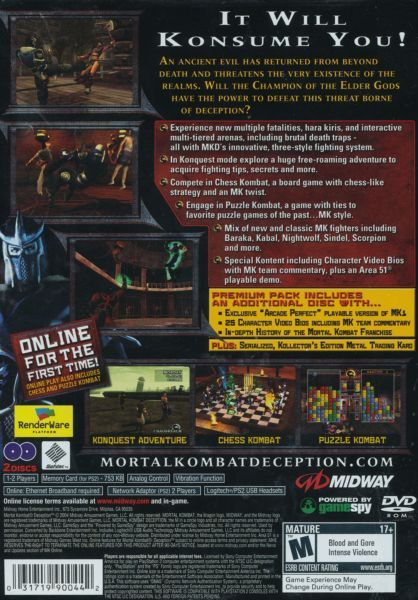 Mortal Kombat: Deception takes the series to the next level with multiple fatalities per character, interactive backgrounds, and new game modes. For the first time in the Mortal Kombat series, you can play a free-roaming Konquest mode, board games, and a puzzle game, in addition to the enhanced one-on-one fighting mode. Mortal Kombat: Deception supports online play for both the PS2 and Xbox Live and features online matches and tournaments as well as online gameplay capabilities for both the board game and puzzle modes.