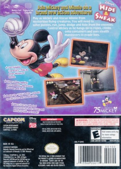 Disney's Hide and Sneak, known as Mickey and Minnie Trick and Chase in Japan, is an action-adventure video game released in 2003 by Capcom. This is last game to featuring Mickey Mouse as protagonist until 2010 video game Epic Mickey.