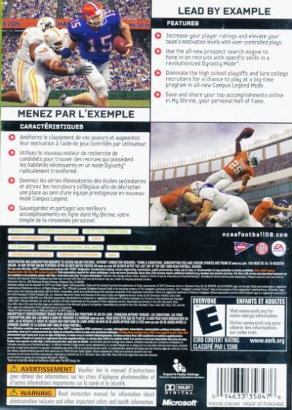 Put your heart, hustle and toughness on the line and lead your program to the BCS National Championship Game in NCAA Football 08. With all-new Leadership Control, boost the motivation level of your teammates by taking control and making big plays. Featuring an all-new Campus Legend mode and an even deeper Dynasty Mode, put your coaching prowess and integrity to the ultimate test. With all-new My Shrine, Home Field Advantage, and exciting new plays like the Statue of Liberty NCAA Football 08 is everything that's great about college football. What kind of legacy will you leave?
