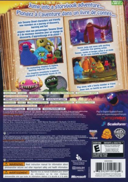 Sesame Street: Once Upon a Monster is an uplifting and funny, family adventure game playable on Kinect for Xbox 360. Players join favorite Sesame Street characters Elmo, Cookie Monster, Oscar, Grover and all new characters as they discover a long lost children's book titled Once Upon a Monster. As they read, they join the action to become part of a living storybook adventure, helping new monster friends with their problems by exploring the book chapter by chapter, page by page. It features active co-op gameplay that is specially designed for sibling and/or parent-child co-play; and teaches social, emotional, and other important life lessons through its colorful and whimsical gameplay.
