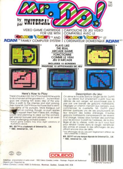 You control Mr. Do has he tries to harvest all of the cherries on the screen. However, there are numerous bad guys out to get him! Mr. Do can defend himself from the badguys in two ways: first he can push the apples located throughout the playfield on top of the enemies and crush them. Secondly, Mr. Do is armed with a power ball. This can be thrown to destroy an enemy. Mr. Do has only one power ball, though, so he will need to wait for it to return to him before it can be used again. From time to time an alpha monster will appear on the screen bearing one of the letters in EXTRA. If you use the power ball to destroy an alpha monster you earn that letter; when you've earned the complete word EXTRA you receive an extra life. When you successfully collect all of the cherries, you will move on to the next, more difficult level.