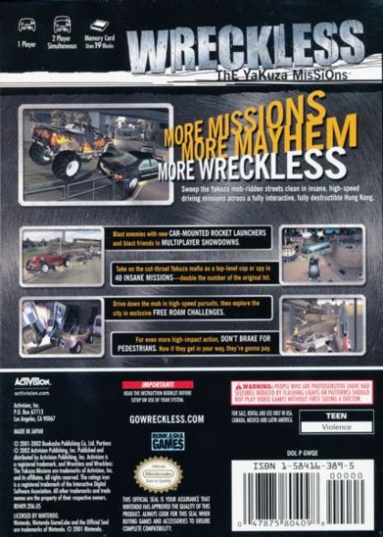 WRECKLESS: The Yakuza Missions- the top-selling mission-based combat game for the Xbox™ video game system from Microsoft is hitting the Nintendo GameCube computer entertainment system with cool new features and exclusive mini-missions. In this high-suspense, high-speed, mission based driving game, players choose one of two roles, each with its own storyline; that of an elite anti-Yakuza squad member or a high-level secret agent. WRECKLESS: The Yakuza Missions features all the ultra-realistic, interactive environments and pulse-pounding missions of the Xbox™ version, plus two-player action, more vehicles, new sub-missions that unlock cheats, more interactive pedestrians, 60 fps gameplay, and a "Free Roam" mode that lets players explore the city without having a mission to complete.