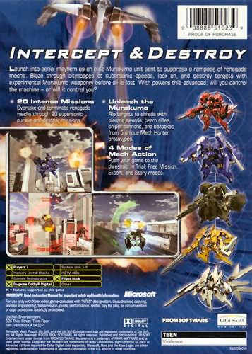 Murakumo is a futuristic action game starring armored bipedal robots with the ability to fly. Players can freely move their robot around a 3D city called Oliver Port to stop other models (known as A.R.K., or Artificial Reflexive Kineticoids) from harassing the population. It is unknown why the typically stable machines are suddenly malfunctioning, since they were originally designed to help mankind maintain peace throughout the land. Now they are a threat. Could this be part of some diabolical plot to overtake the city? As part of a special service team financed by the corporation that designed the robots, players must search the city on the ground and in the air until they find their target(s). A number of explosive weapons can be used to neutralize the enemy, but players need to be wary of surrounding buildings and objects. Contact with structures results in damage to the armor and can eventually lead to pieces flying off. The action is divided into a series of missions, where players have the opportunity to select from a total of six A.R.K. models before attempting to complete their objectives. Murakumo's gameplay involves selecting a mission, choosing which of the available A.R.K.s to pilot, and then viewing data such as target information, pictures of the vicinity, and other pertinent information. After looking at the A.R.K.'s equipped payload and making a final assessment before going into battle, players can finally embark on the mission, which involves hunting down the specific threat as well its support. Once the objective is complete, players will receive an evaluation based on completion time, amount of damage received, number of collisions suffered, average speed, and defeated enemies. Players can save recorded replays after each mission as well as their progress. Modes of play include Scenario, a series of missions following a narrative; Free Mission, which lets players revisit any of the completed missions in Scenario; and Expert Mission, which opens up once players have satisfied certain parameters in Scenario. Options include the ability to reassign controller functions, configure cockpit displays, and individual toggles for vibration and captions during cut-scenes. A separate database also exists for players to learn more about the world of Murakumo.