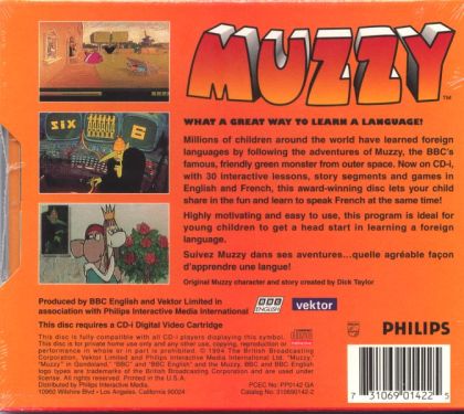 Millions of children around the world have learned foreign languages by following the adventure of Muzzy, the BBC's famous friendly green monster from outer space. Now on CD-I with 30 interactive lessons, story segments and games in English and French, this award winning disc lets your child share in the fun and learn to speak French at the same time.
