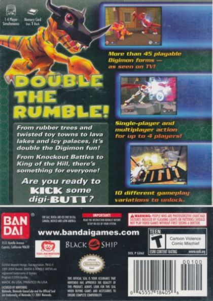 The first in the series to appear on the current generation of home consoles, Digimon Rumble Arena 2 takes melée battling to new heights of fast-paced bedlam. Bash the living daylights out of opponents in gorgeously rendered 3D environments, ranging from the deserts of the wild west in Danger Gulch, to the conveyor belts of the Factory and the deathly bubbling pools of Lava Lake.