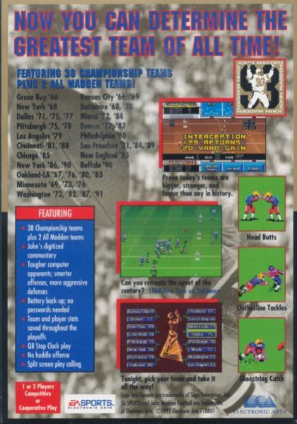A rental-only version of the game, John Madden Football: Championship Edition, uses only "championship caliber" line-ups from the 1966-1991 era. Although it still lacks official names, this version features correct team colors.