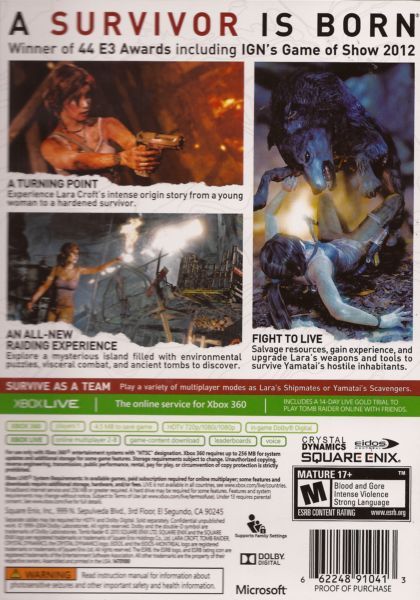Tomb Raider is a fresh reimagining of the classic action-adventure franchise and will explore the intense and gritty origin story of an iconic character. In the game, Lara Croft will ascend from a frightened young woman on her first adventure and emerge as a hardened survivor. Armed with only her instincts and her innate ability to push beyond the limits of human endurance, Lara must fight, explore, and use her intelligence to unravel the dark history of a forgotten island and escape its relentless hold. With high-octane cinematic set pieces, visceral third-person combat, and large levels for Lara to navigate and explore, Tomb Raider is aiming to reinvent the action genre and recapture fans' imagination with the original female video game heroine.