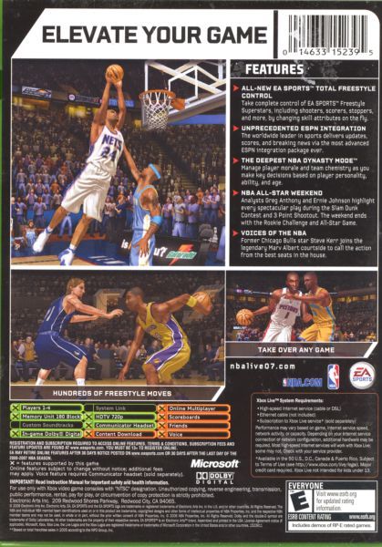 Powered by the most intelligent and intuitive gameplay engine ever created, experience realism like never before during All-Star Weekend, and an advanced Dynasty Mode that challenges you to manage your team to the NBA Finals. While online*, never miss breaking news with the most advanced ESPN integration package ever offered with news in-game while you play, including ESPN Motion and radio podcasts. Whether challenging your rivals at home or online anywhere in the world, your game has been elevated to the next level with NBA LIVE 07.