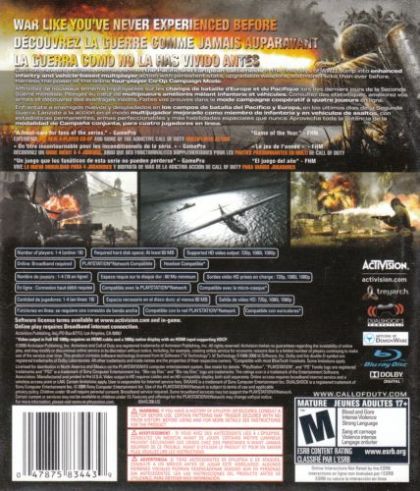 Building on the Call of Duty 4 engine, Call of Duty: World at War thrusts players into the ruthless and gritty chaos of WWII combat like never been before, and challenges them to band together to survive the most harrowing and climactic battles of WWII that led to the demise of the Axis powers on the European and South Pacific fronts. The title re-defines WWII games by offering an uncensored experience with unique enemies and combat variety, including Kamikaze fighters, ambush attacks, Banzai charges and cunning cover tactics, as well as explosive on-screen action through all new cooperative gameplay.