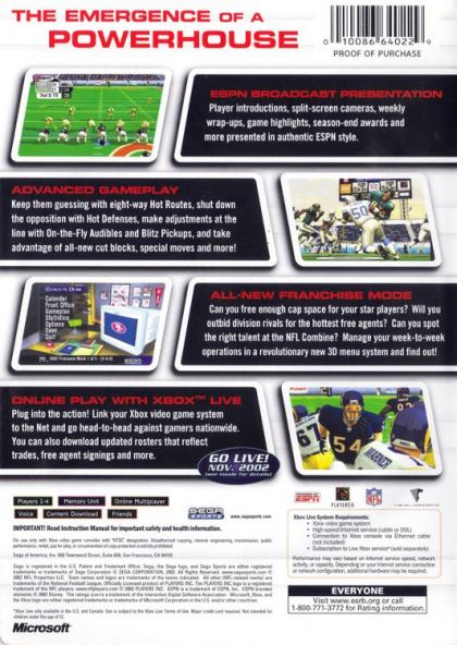 NFL 2K3 continues Sega's successful football franchise with the addition of an ESPN license, allowing for distinctive menu screens, music, and a television-style presentation complete with player matchups, dramatic replays, and statistical highlights as the game progresses. Player models have also been addressed and now feature more frames of animation to show such details as stripping the ball, one-handed tips, hurried throws, chop blocks, and more. Coaches also roam the sidelines as in the Madden NFL series. A franchise mode allows would-be general managers to draft and sign players from the front office desk, manage the salary cap, hire and fire coaching staffs, and deal with retirement, cuts, and trades over multiple seasons of play. The computer AI has also been refined. Teams are designed to react to play-calling tendencies by shifting coverage schemes during passes and runs to shore up potential holes and to isolate the ball carrier. Both PlayStation 2 and Xbox versions of NFL 2K3 offer online support for play against opponents over the Internet.