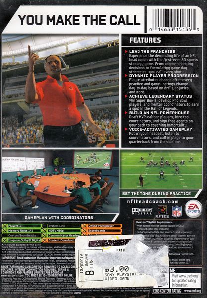 NFL Head Coach gives you the ultimate dream of a sports fan: To be head coach on your favorite NFL team, in the first-ever 3D sports strategy game. It's up to you to coach from the sideline, conduct practice, make draft day deals to snag a future superstar, and delegate responsibilities to your assistants. Your knowledge of football will drive your success -- but be prepared to deal with the failures, too. The emotional rollercoaster ride that is professional coaching comes to life for you. Voice-Activated Gameplay - Interact with your players on the sideline during the game to change strategy, or motivate them to give extra effort Learn from ESPN Experts - Trey Wingo walks you through the game from the set of ESPN's NFL Live and gives you background information about the coach you create