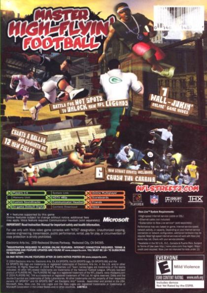 Defy gravity and stretch your game to the skies with NFL STREET 2. Receivers can now run off the walls, change passing lanes by running your QB up a building, and take advantage of eye-popping wall jukes and all-new hurdles. You better hold on to the ball because defenders fly across the field in ways never before seen in a football game. Players now descend on Bay City, an all-new persistent world to build their teams, their reps, and their battle plans one field at a time. Once you own the walls, you will own the city.