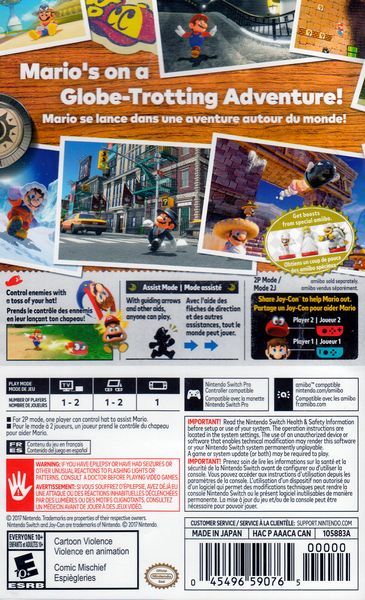 Join Mario on a massive, globe-trotting 3D adventure and use his incredible new abilities to collect Moons so you can power up your airship, the Odyssey, and rescue Princess Peach from Bowser's wedding plans!