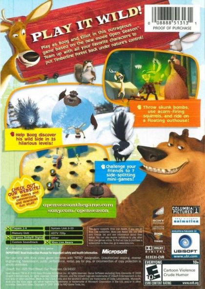 Open Season is a riotous romp in the great outdoors, where the rowdy brood of forest animals turns the tables on a bunch of unsuspecting hunters. When a domesticated grizzly named Boog gets lured into leaving the creature comforts of home by a fast-talking mule deer named Elliot, he finds himself lost in the woods just three days before hunting season. Forced to "rough it" in the great outdoors, Boog goes native, rallying all the forest animals to take back their home and send the hunters packing. The Open Season video game will allow player to relive the movie experience by playing as Boog and Elliot.