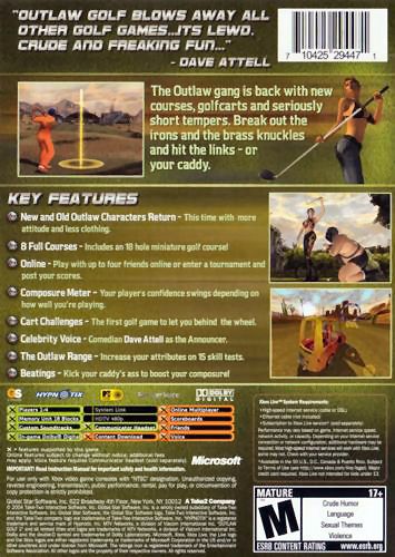 Hypnotix Inc.'s uncouth sports game series continues with the release of Outlaw Golf 2, which features a new lineup of fictitious courses, rebellious characters, and updated computer AI and controls. As in the original, players can still beat up their caddy to maintain composure, which changes during the course of play depending on well the golfer performs. Slice the ball or miss a putt and composure will deteriorate, making it more difficult to swing the club or sink a putt on subsequent shots. Also new to the series is the ability to ride a golf cart to compete in an assortment of stunt challenges. As in the original Outlaw Golf, an analog swing system is used to hit the ball, but players can now challenge other aggressive golfers online via Xbox Live.