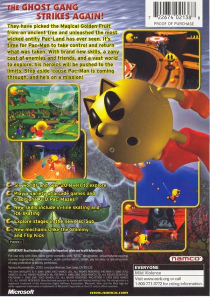 This sequel to Pac-Man World has the circular yellow star running and jumping through a 3D world instead of the side-scrolling stages found in the original. While clumsily making their way through Pac-Land, the four ghosts inadvertently plucked magical golden fruit from a tree in the center of Pac-Village. This awakened a dark creature named Spooky, who orders the ghosts to hide the fruit throughout the land. Thus begins a quest to regain the golden fruit across six multi-staged areas: Forest, Tree Tops, Snow Mountain, Lava, Ocean, and Ghost Island. Players begin the game in Pac-Village, which offers a number of dots to munch, fruit to gulp, and tokens to collect, setting the stage for the rest of the adventure. Each level features a specific number of fruit types, which earn players points and contribute to an overall completion percentage. In order to receive a 100 percent rating on each level, every item must be collected. While dots and fruit offer points, tokens hidden throughout the levels allow players access to emulated versions of Pac-Man, Ms. Pac-Man, Pac-Mania, and Pac-Attack. Also hidden on certain levels is a Galaxian icon, which opens up a single 3D maze played in a similar manner as Pac-Man. Players can revisit these mazes in the arcade once they are unlocked in the main game. Power-ups found on levels include the Steel Ball, which allows Pac-Man to open crates underwater or withstand fiery blasts, Power Pellets enabling him to munch on the deadly ghosts lurking about, and Shrink, which allows Pac-Man to fit into tiny openings otherwise inaccessible. Health Wedges and Extra Lives are also available at various points. While levels generally involve jumping, rolling, or bouncing atop suspended platforms while avoiding enemies, other stages have Pac-Man using ice skates, Rollerblades, flippers, and a Pac-Sub. As he progresses through the game, Pac-Man must battle mechanical contraptions piloted by one of the ghosts. Only by successfully defeating these bosses will Pac-Man be able to acquire the golden fruit and advance to the final showdown with Spooky. Players can also revisit completed levels to enter a Time Trial event, where bonus tokens are earned for completing a level within the target time.