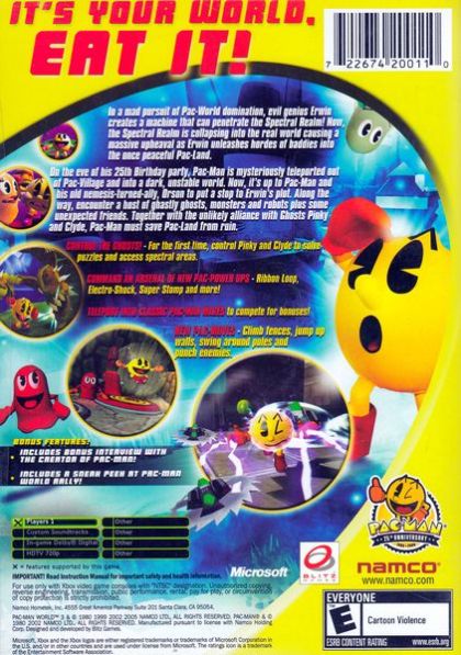 In a mad search for power, evil genius Erwin creates a machine that can penetrate into the Spectral Realm. But now, the Spectral Realm is collapsing into the real world and this will bring about a massive catastrophe that will plunge the world into a state of devistation for years to come. After mysteriously having been transported out of Pac-Village and into this strange and different land, Pac-Man must uncover Erwin's plot and save the world. Along the way, Pac-Man will meet a host of unexpected "old friends," and in order to defeat the ultimate enemy, he might just have to turn his old foes into allies. New Pac-Man moves such as climb fences, jump up walls, swing around poles and punch enemies Includes the original Pac-Man arcade game from 1980