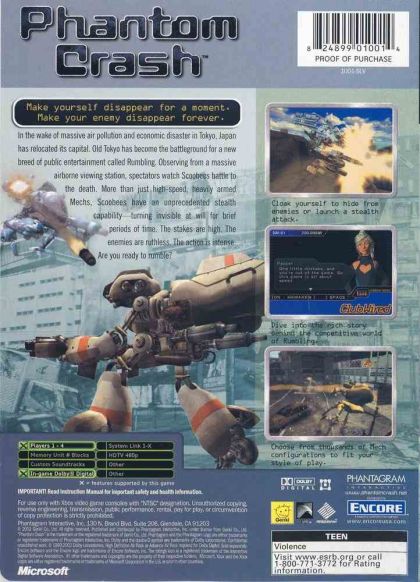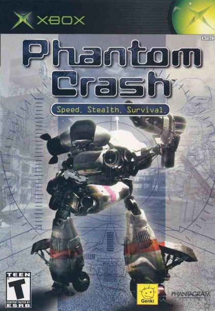 Phantom Crash has players battling giant robots in a futuristic sporting event. The city of Tokyo has relocated to a manmade island due to the ravages of pollution and overcrowding. While the former location is no longer inhabitable by humans, it serves as the perfect battlefield for a sport called Rumbling. It quickly becomes a televised hit, and soon pilots of all abilities are sought to compete in this new form of mechanized combat. Players can choose from a number of different pilots in Phantom Crash, each having his or her own type of armored assault robot or Scooter. Scooters can be further customized from cash earned in competition, allowing for different chassis, weapons, jump jets, and limb types. Combatants can lay siege in traditional bipedal models, or slink close to the ground in spider-like bodies and similar variants. Each metallic monster is also outfitted with a special camouflage capability, allowing the unit to blend in with the environment to make surprise attacks, similar to the technique used by the Predator in the eponymous feature film. To combat this, players can rely on radar sensors to help pinpoint enemy threats. Camouflage can be disrupted by a direct hit or after running out of rechargeable battery power. Phantom Crash supports up to four players using a split-screen viewpoint. Control makes use of both analog sticks, one to guide the legs, and the other to target. In this way, Scooters can aim independently of movement, allowing players to move in one direction while firing in another. The environment also plays a role in the game's strategy, as players can seek cover behind dilapidated buildings and structures.