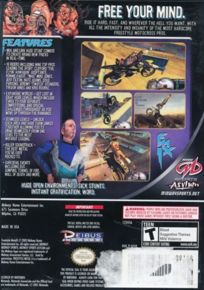 Freestyle MetalX features nine of the sickest riders pulling endless eye-popping tricks in stunning open environments. Pro rider legends include: Clifford "The Flyin' Hawaiian" Adoptonte, Jeff Tilton, Nate "Destroyer" Adams, Jeremy "Twitch" Stenberg, Trevor Vines, "Mad" Mike Jones, Kris "The Rock" Rourke, Kenny Bartram and Ronnie "Kung Fu" Faisst. In addition, Freestyle MetalX is totally customizable, allowing gamers to choose from 16 riders, options of motocross gear and unique bike models to create the ultimate hardcore, bone-breaking freestyle motocross experience. Gamers can create their own motocross arenas with an advanced level editor and take on creative sub-games, like riding off a cliff and turning into a human dart aimed at a giant dartboard. The game also features special DVD content, which offers a sneak peek into the daredevil lifestyles of real motocross sensations and a behind-the-scenes look at the making of Freestyle MetalX. Top metal bands such as Motley Crue, Megadeath, Motorhead, and Twisted Sister also amp-up the intensity in the game with hardcore music that will shake the arena.