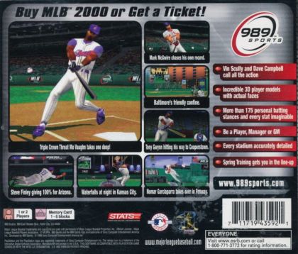 Last year's best playing baseball game on the PlayStation has moved into the 21st century. If you love baseball, come join Vin Scully along with Dave Campbell from the booth as well as Mo Vaughn and the rest of your favorite players from the field in MLB 2000 from 989 Sports.