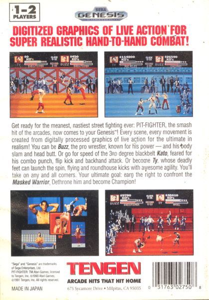 Pit-Fighter is a 3rd-person fight game that features digitized graphics of real fighters and zooming effects. Players select one of three fighters (Buzz, Ty or Kato) to take on anyone who dares. At the conclusion of a match, players are individually awarded a Knockout Bonus, Brutality Bonus, and a Fight Purse. Every third match is a Grudge Match where players test the skills of each other. The last man standing is the winner of this three-knockdown match. Players fight their way to the Elimination Match to decide who wins the opportunity to dethrone the champion, the Masked Warrior.